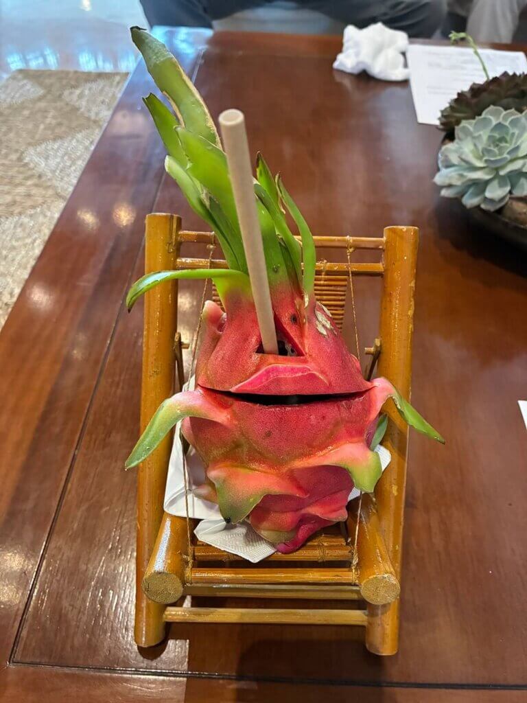 ドラゴンフルーツのウェルカムドリンクをいただきながら、現地ガイドさんがチェックイン手続きをしてくれました。