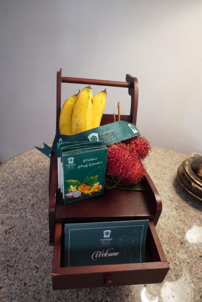 ウェルカムフルーツや瓶入りの水が用意されていて、エアコンも効いていて快適です。
