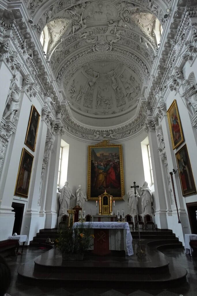 外観はシンプルながら、内部は真っ白な漆喰装飾で埋め尽くされており、その美しさに息をのみました。