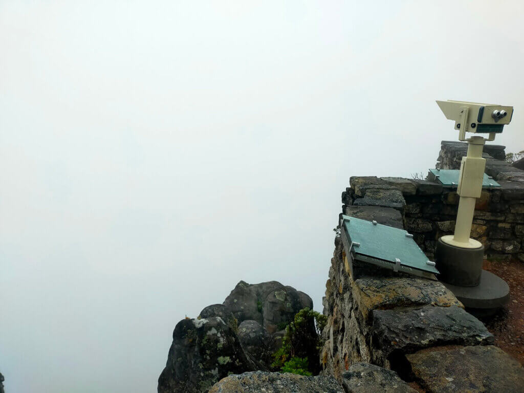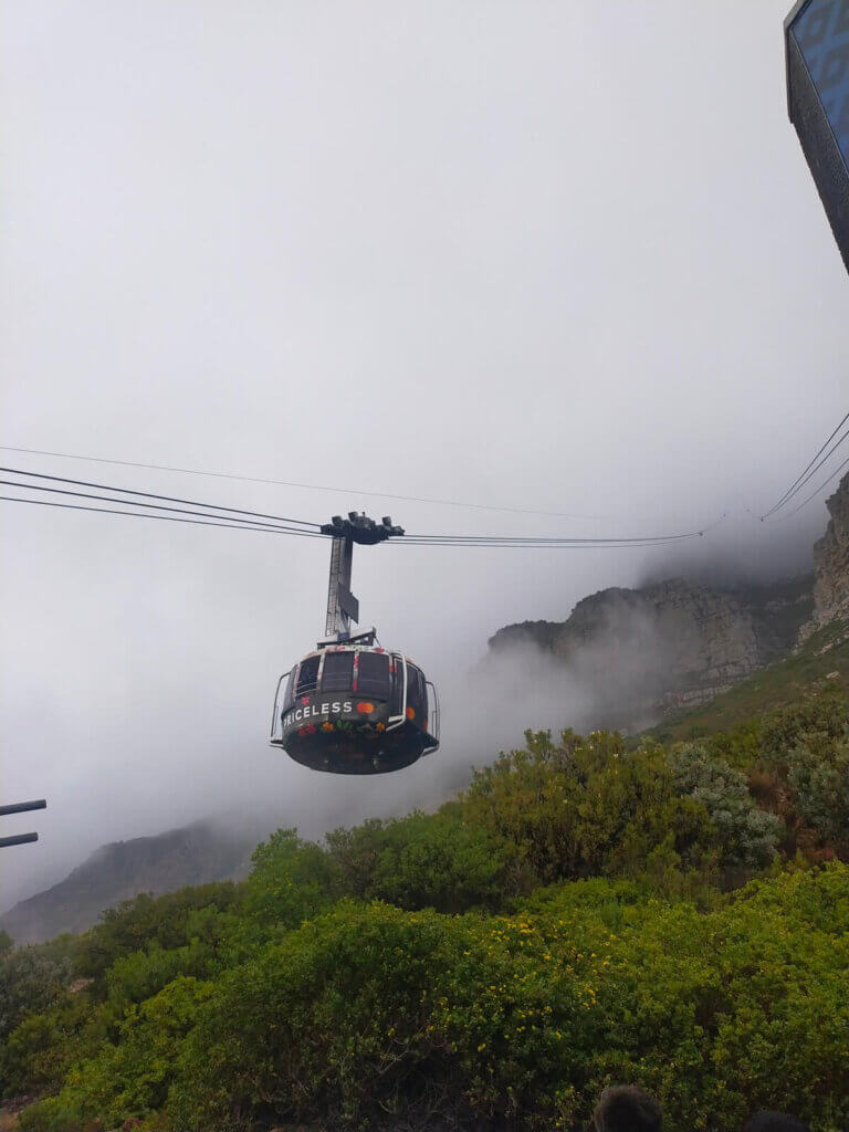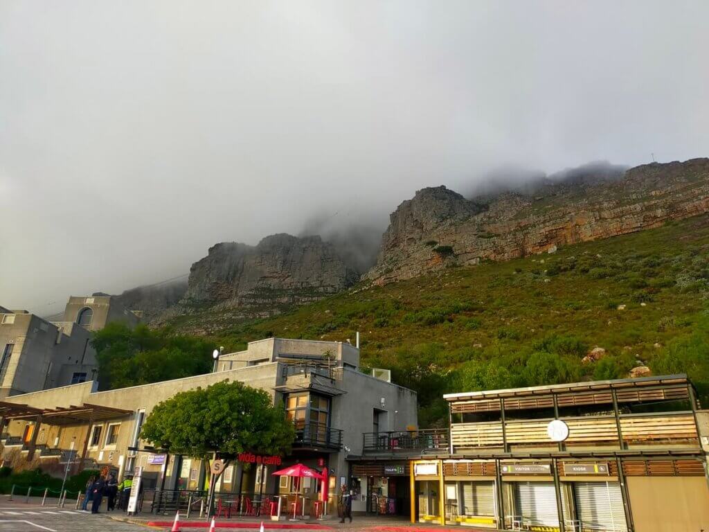 霧に包まれたテーブルマウンテン。今日は登れるのだろうかと少し不安に。