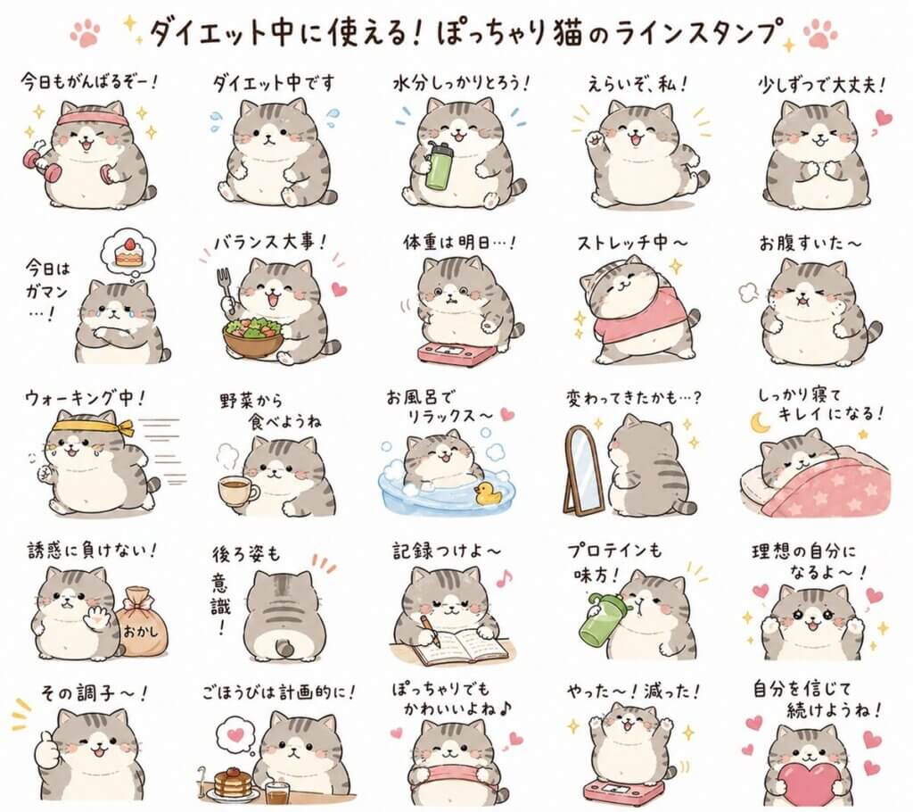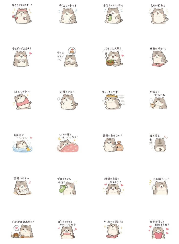 「ダイエット中に使える、ぽっちゃり猫のLINEスタンプを25個セットで作ってください。表情豊かで、それぞれにメッセージ(『今日もがんばるぞー!』『水分しっかりとろう!』など)を添えてください」